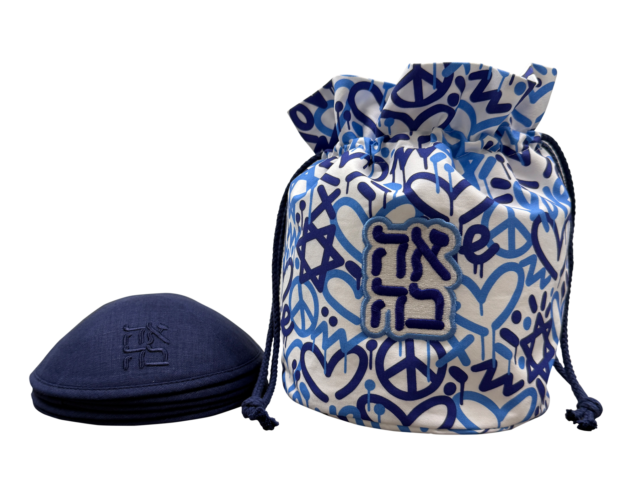 Rooted in tradition and reimagined with modern design, this exclusive kippah bag features artwork by Corey Paige Designs. Embroidered with Ahava, the Hebrew word for love, it’s both meaningful and versatile, ideal for keeping your kippot organized, carrying essentials while traveling, or using however love inspires you.